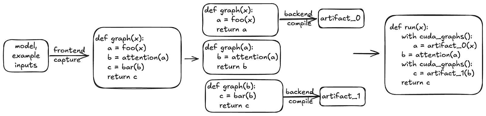 CUDA Graphs is one example where having a compiler is helpful. CUDA Graphs reduce launch overhead but require certain assumptions on your code (e.g. it must only use CUDA operations, input Tensors must have static memory addresses). torch.compile is able to automatically split graphs at unsupported operations to create smaller graphs that are safe to CUDA Graph as well as automatically manage static input buffers.